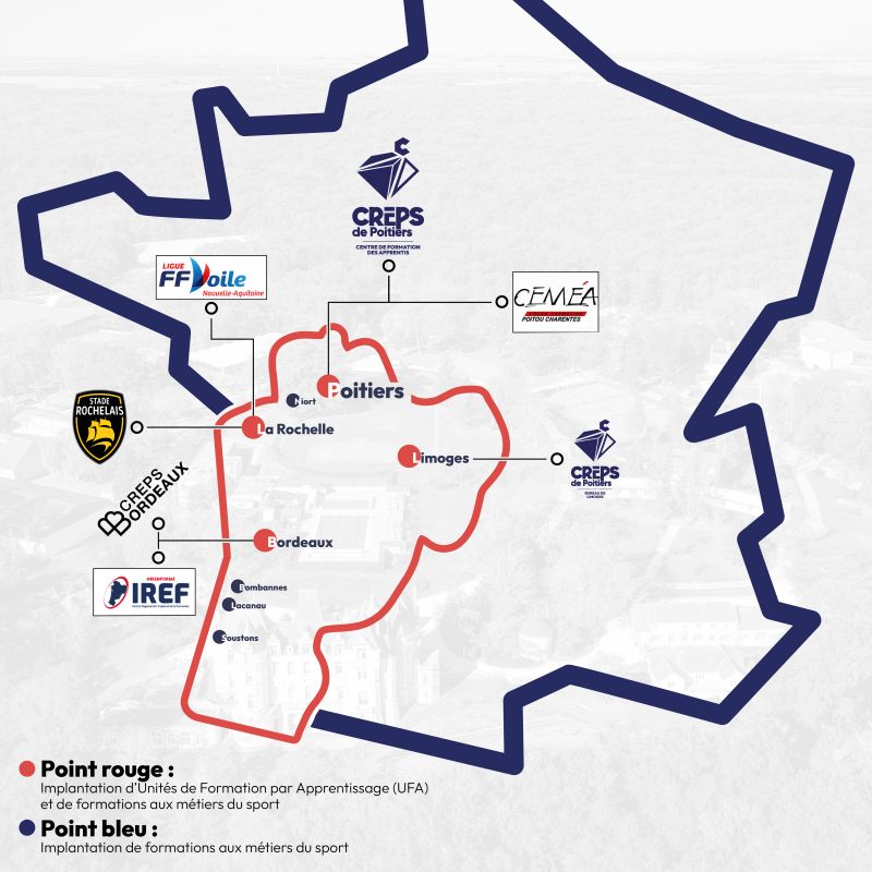 Grâce au CREPS de Poitiers, ses différentes UFA et à leurs antennes respectives, une offre de formation initiale et continue riche et variée, qu'elle soit initiale ou continue, se déploie sur l'ensemble du territoire néo aquitain.