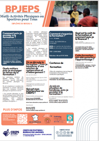 Le BPJEPS MAPST (Multi Activités Physiques ou Sportives pour Tous) prépare aux métiers d’animateur et d’éducateur des activités physiques et sportives pluridisciplinaires (activités physiques d’entretien corporel, activités physiques en espace naturel, activités physiques et jeux sportifs ludiques) pour tous les publics (de la petite enfance à la personne âgée sans perte d'autonomie, ni incapacité d'ordre physique ou fonctionnel mais aussi des personnes en situation de handicap physique, psychique et mental).