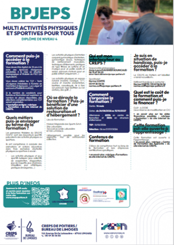 Le BPJEPS MAPST (Multi Activités Physiques ou Sportives pour Tous) prépare aux métiers d’animateur et d’éducateur des activités physiques et sportives pluridisciplinaires (activités physiques d’entretien corporel, activités physiques en espace naturel, activités physiques et jeux sportifs ludiques). Cette formation s’adresse à l’ensemble des publics, de la petite enfance aux personnes âgées autonomes, et inclut également l’accompagnement de personnes en situation de handicap physique, psychique ou mental.